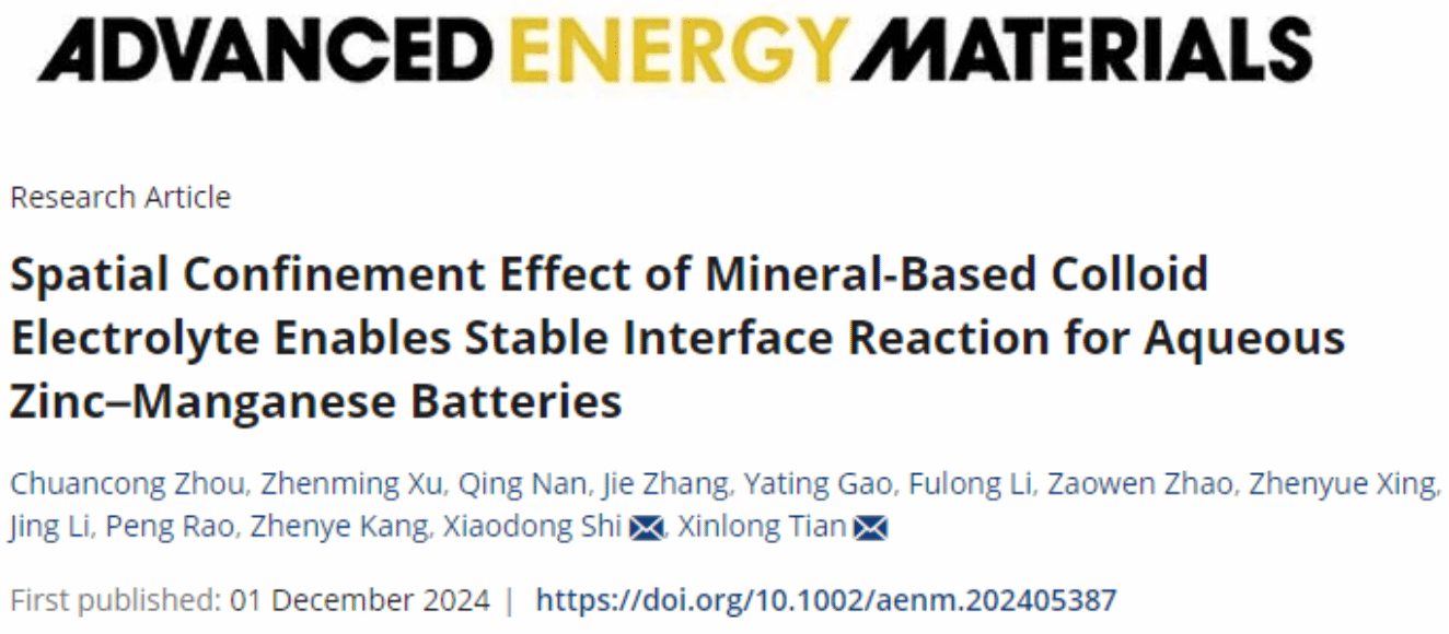 12月1日,万象城allwincity官网史晓东副教授所在团队在能源领域顶级期刊Advanced Energy Materials发表题为“Spatial Confinement Effect of Mineral-based Colloid Electrolyte Enables Stable Interface Reaction for Aqueous Zinc-Manganese Batteries”的研究论文。万象城allwincity官网2021级博士研究生周传聪为论文第一作者,史晓东副教授和田新龙教授为论文共同通讯作者。