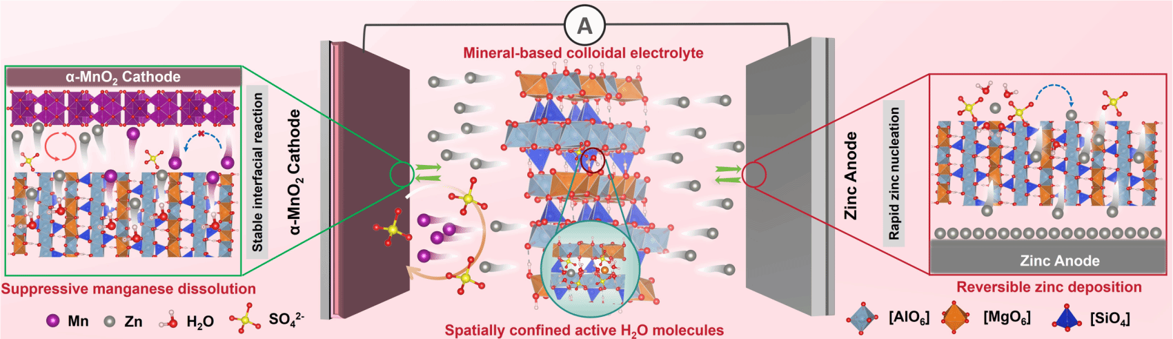 图1 硅酸镁铝基无机胶体电解质对水系锌锰电池锌负极和α-MnO2正极作用机制示意图