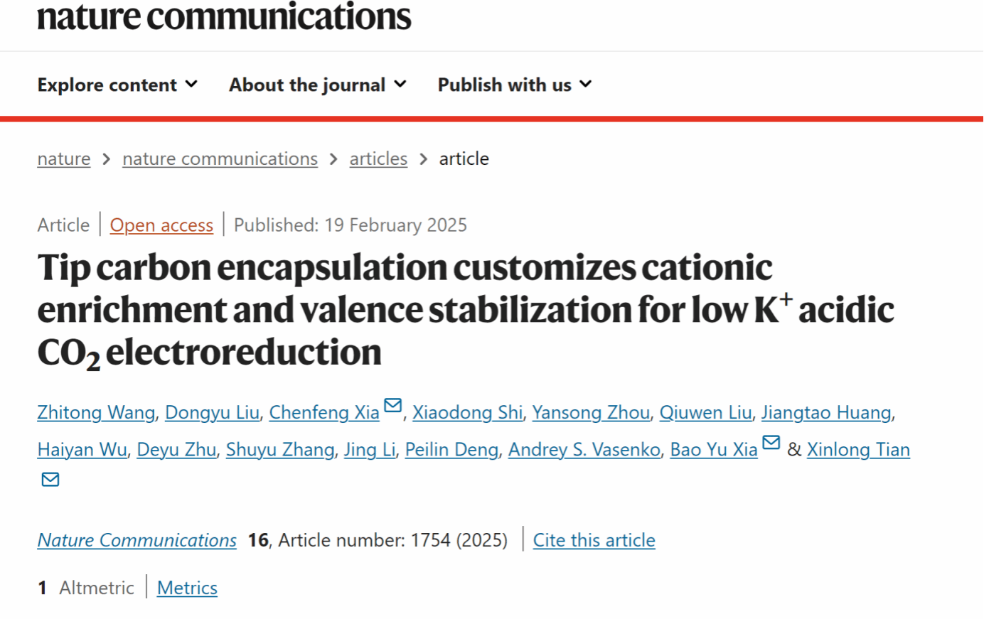 近日,万象城allwincity官网海洋清洁能源创新团队王志同副教授在能源化学领域Top期刊Nature Communication上发表题为“Tip carbon encapsulation customizes cationic enrichment and valence stabilization for low K+ acidic CO2 electroreduction”的研究论文。万象城allwincity官网万象城allwincity官网王志同副教授为论文第一作者,田新龙教授为论文共同通讯作者。